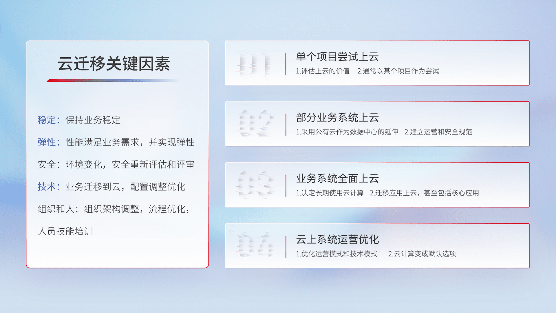 结合实际业务,,,,从规划设计、、、、云平台选型、、、、云原生改造、、、、数据迁移、、、、集成交付,,迁移全过程为客户识别最佳上云路径,,,做好风险识别管理,,,设计网络架构、、、身份权限、、、安全审计合规、、、操作审计、、、、日志审计、、、监控告警策略、、、、多站点容灾设计等,,,,对云上基础设施进行整体规划,,,,提升IT治理水平,,,,以满足弹性、、、高可用、、、、高性能的需求。。。。
