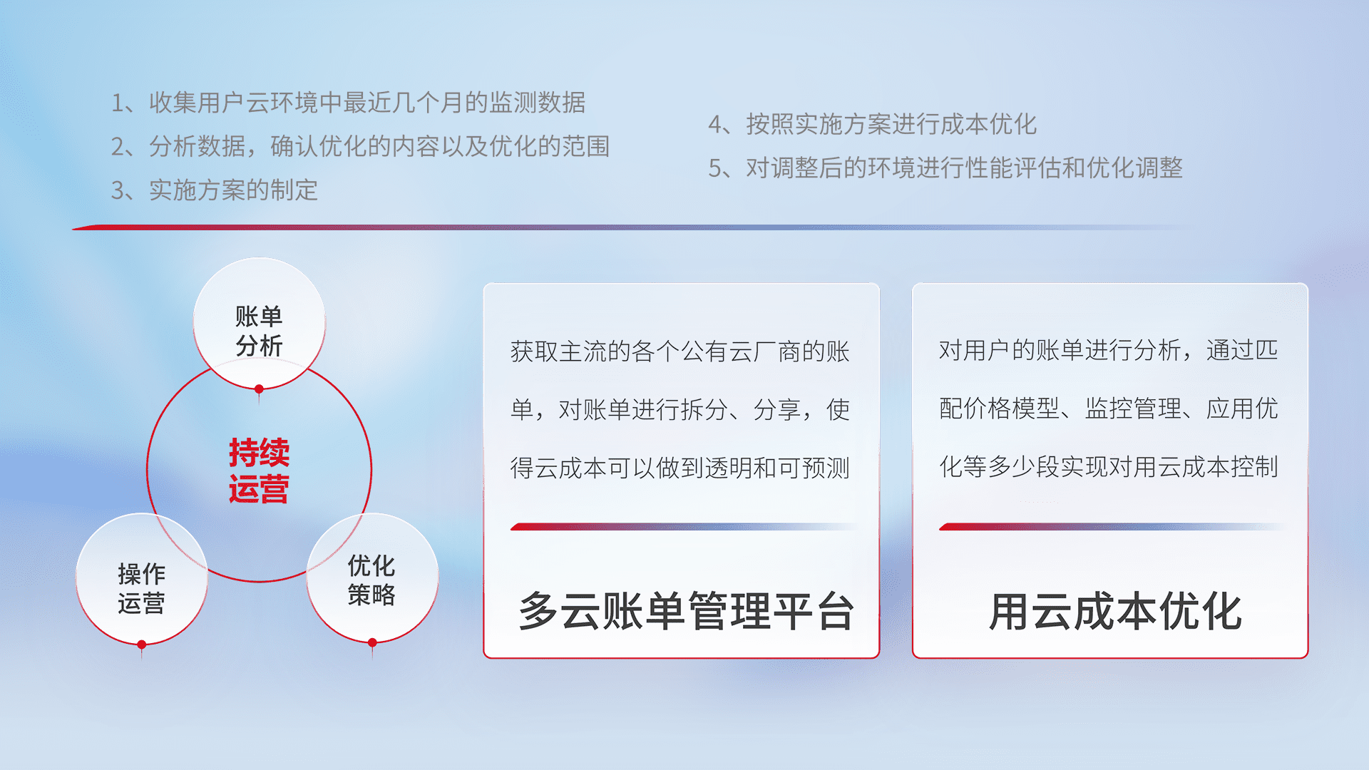 通过多云纳管,,以统一的资源数据模型把客户的云资源进行抽象和封装,,,,进而实现对多云资源的统一操作,,,,保障云资源管理的可靠性、、、稳定性与可用性。。。。量身定制化运维内容,,配置、、开发运维、、补丁管理、、、备份、、、监控、、、、认证和访问管理、、、、审计和日常巡检等,,保障在用云过程中的可靠度,,稳定度以及高可用率。。。。